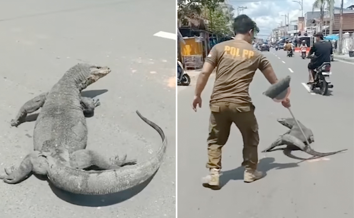 Man Attempt To Put Komodo Dragon Off The Road: दुनियाभर में ऐसे कई जीव मौजूद हैं, जिन्हें देखकर कई बार खुद की ही आंखों पर यकीन कर पाना मुश्किल हो जाता है. हाल ही में एक ऐसा ही वायरल वीडियो लोगों की रूह कंपा रहा है, जिसमें एक विशाल छिपकली बीच सड़क पर रेंगती नजर आ रही है, जिसे देखकर वहां मौजूद लोग हक्के-बक्के रह गए.