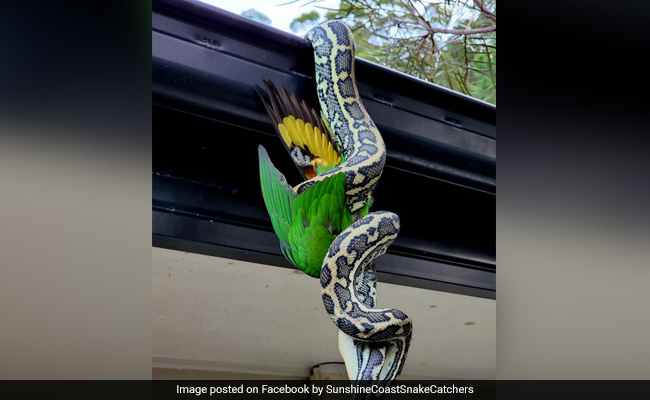 एक विशाल अजगर (giant python) को उल्टा लटकते हुए एक पक्षी (rainbow lorikeet) को खाते हुए दिखाया गया है. ऑस्ट्रेलियाई सांप (Australian snake) हटाने के व्यवसाय सनशाइन कोस्ट स्नेक कैचर्स 24/7 (Sunshine Coast Snake Catchers 24/7) के स्टुअर्ट मैकेंजी (Stuart McKenzie) ने फेसबुक (Facebook) पर सांप की तस्वीरें पोस्ट कीं. तस्वीरों में तटीय कालीन अजगर (carpet python) छत से उल्टा लटकता नजर आ रहा है. सरीसृप के दोनों ओर पक्षी के पंख भी देखे जा सकते हैं, क्योंकि इसका सिर विशाल सांप के मुंह से पूरी तरह से घिरा हुआ है.