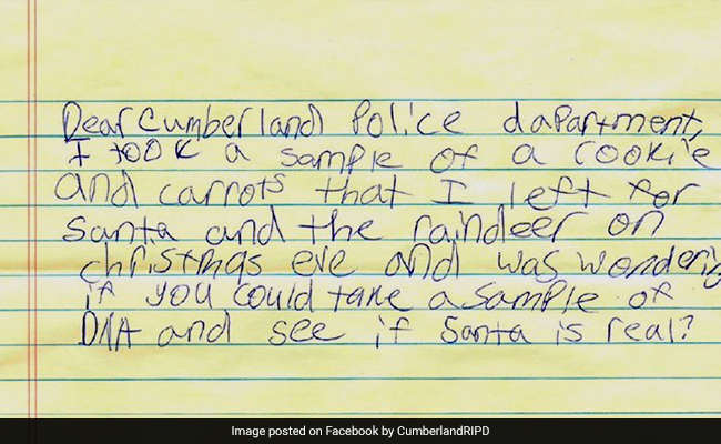 सोशल मीडिया प्लेटफॉर्म फेसबुक पर इन तस्वीरों को कंबरलैंड पुलिस ने शेयर किया है. एनपीआर की खबर के अनुसार, 10 वर्षीय बच्ची स्कारलेट डौमैटो ने अपने स्थानीय पुलिस विभाग को सेंटा क्लॉज के अस्तित्व को साबित करने के लिए डीएनए के लिए बची हुई गाजर और कुकीज का औपचारिक रूप से टेस्ट करने की मांग करते हुए एक लेटर लिखा. वहीं बच्ची के इस मासूम से अनुरोध को पुलिस सोशल मीडिया पर शेयर करने से खुद को नहीं रोक पाई.