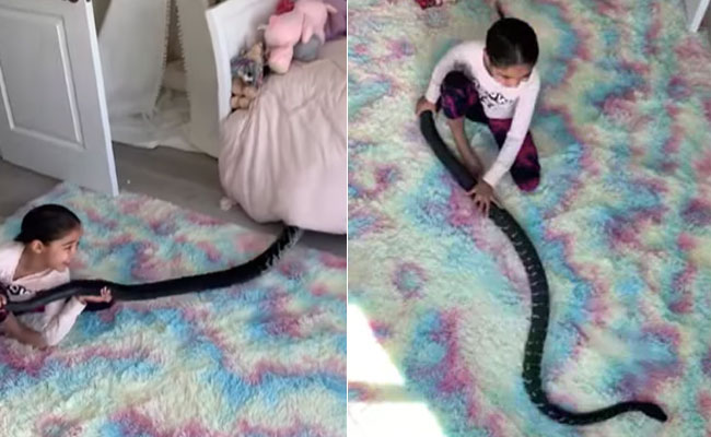 सांप जिसके नाम भर से लोग डर के मारे कांपने लगते हैं. सांप ही है जो अच्छे-अच्छों की हवा टाइट कर देता है. हाल ही में सांप से जुड़े कई वीडियोज इंटरनेट पर देखने को मिले रहे हैं, जिसमें विशालकाय भयानक सांप का गुस्सा हर किसी के रोंगटे खड़े कर रहा है. सोचिए अगर एक विशालकाय सांप अचानक आपके बिस्तर के नीचे से निकल आए तो आपका क्या रिएक्शन होगा, जाहिर सी बात है कि डर के मारे आपकी हालत खराब हो जाएगी और हो सकता है कि आप बिस्तर से नीचे कदम भी न रखें, लेकिन हाल ही में वायरल हो रहे इस वीडियो में एक छोटी सी बच्ची एक विशालकाय सांप से ऐसे डील कर रही है, जैसे वो उसका ही कोई खिलौना हो.