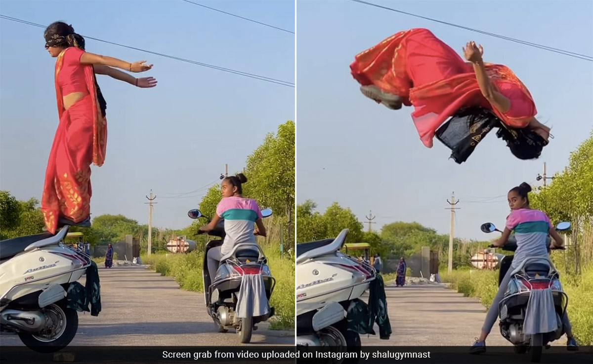 इस चौंका देने वाले वीडियो में एक लड़की एक अलग ही लेवल का करतब दिखाती नजर आ रही है, जिसे देखकर लोग दांतों तले उंगली दबा रहे हैं. सोशल मीडिया प्लेटफॉर्म इंस्टाग्राम पर इस वीडियो को शेयर किया गया है, जिसे खूब देखा और शेयर किया जा रहा है. वीडियो में एक लड़की स्टंटबाजी करती नजर आ रही है. वीडियो में लाल साड़ी पहने एक लड़की नजर आ रही है, जो अपनी आंखों पर पट्टी बांधे हुए है. इस बीच लड़की स्कूटी के बैक सीट पर चढ़कर बैक फ्लिप मारते हुए हवा में ऊपर उछल जाती है. इस दौरान वहां से स्कूटी लेकर गुजर रही लड़की, साड़ी पहने स्टंट मारती लड़की को देखते ही रह जाती है.
