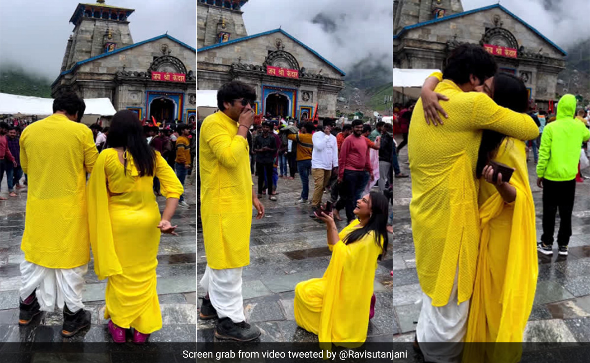 हाल ही में वायरल विश्व प्रसिद्ध केदारनाथ धाम एक वीडियो इन दिनों लोगों के बीच चर्चा का विषय बना हुआ है. कोई इस वीडियो की तारीफ कर रहा है, तो कोई इसे विवादित बता रहा है. वीडियो में पीले रंग के कपड़े पहने ये कपल हाथ जोड़े पहले बाबा केदारनाथ को नमन करता नजर आता है और उसके फिर बाद महिला घुटनों के बल बैठकर अपने पार्टनर को प्रपोज करती नजर आती है. वीडियो में आगे महिला अपने बॉयफ्रेंड (girlfriend proposd to boyfriend) को अंगूठी पहनाते हुए अपने प्यार का इजहार करती है. इसके बाद दोनों एक-दूजे को गले लगाते दिखाई पड़ते हैं.