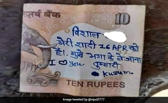 दरअसल, एक प्रेमिका ने 10 रुपए के नोट पर अपने प्रेमी के लिए ऐसा मैसेज लिख दिया जो अब सोशल मीडिया पर काफी तेजी से वायरल हो रहा है. 10 रुपए के नोट पर प्रेमिका ने लिखा, ‘विशाल मेरी शादी 16 अप्रैल को है, मुझे भगा ले जाना. आई लव यू. तुम्हारी कुसुम.' अब ये नोट सोशल मीडिया पर सभी का ध्यान अपनी ओर खींच रही है और लोग इस पर अपना मजेदार रिएक्शन भी दे रहे हैं.