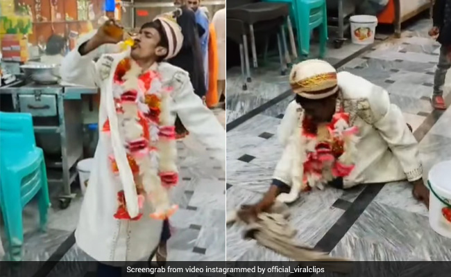 वायरल हो रहे इस वीडियो में दूल्हा धड़ल्ले से एक शॉप में घुस जाता है. इसके अगले ही पल वो फ्रिज से कोल्ड ड्रिंक निकालता है और पीने लगता है. वीडियो में आगे दूल्हा नैपकिन से मुंह साफ करने के बाद उसे फर्श पर फेंक देता है. वीडियो में दूल्हे के एटीट्यूड को देखकर लग रहा है मानो वो कोई शहजादा है, लेकिन जब पैसे देने की बारी आती है, तो दूल्हे 'मिया' फर्श पर बैठ पोछा मारते दिखाई देते हैं. वायरल होता यह वीडियो सोशल मीडिया पर धमाल मचा रहा है.