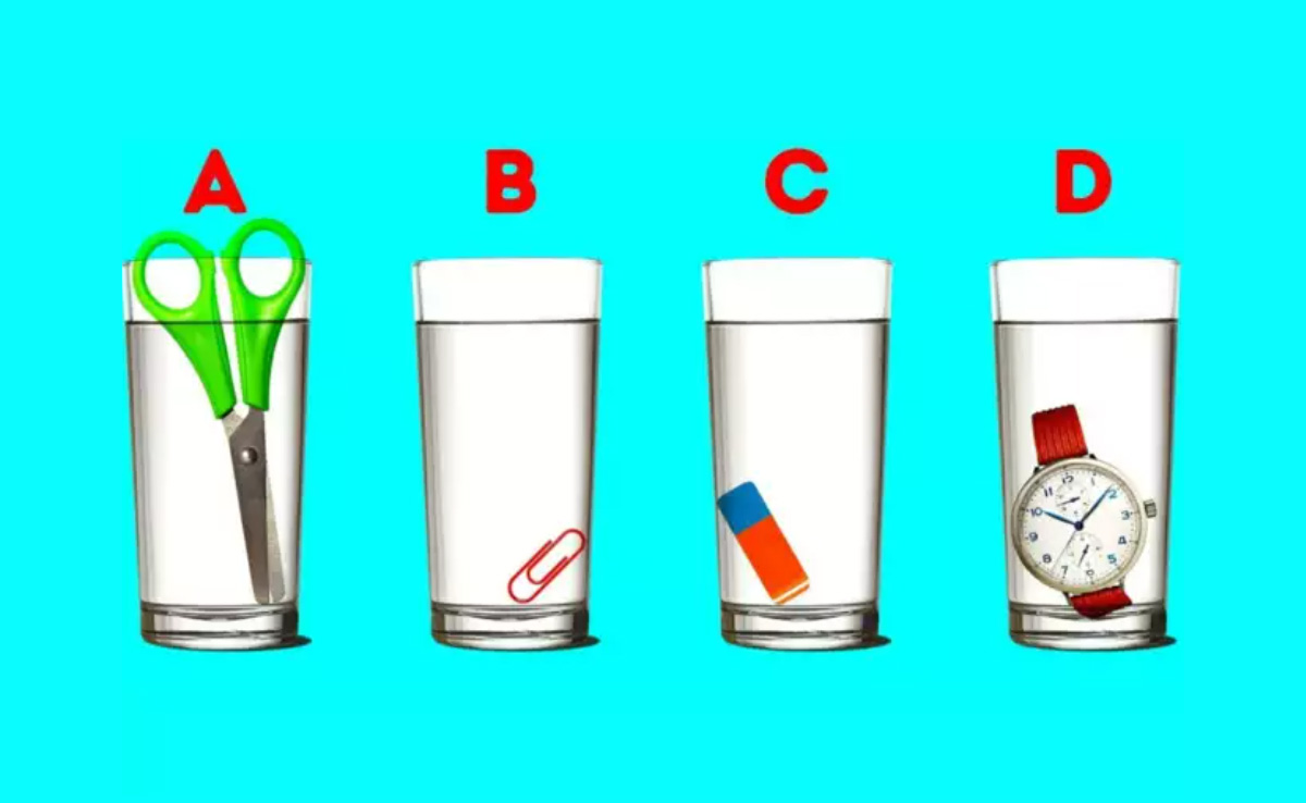 आपको इस वायरल ब्रेन टीजर तस्वीर में चार गिलास नजर आ रहे होंगे. देखा जा सकता है कि, सभी गिलासों में पानी एक बराबर है. हालांकि, पहले गिलास के अंदर एक कैंची डली हुई है. इसी तरह दूसरे में पेपर क्लिप, तीसरे में इरेजर (रबड़) और चौथे में एक हाथ घड़ी है. दिमाग के धागो खोल देने वाली इस पहेली से भरी तस्वीर को आपको बड़ी ही बारीकी से देखना है और सही जवाब खोज निकालना है, जिसके लिए आपको 10 सेकंड का समय दिया गया है. अगर लाख कोशिशों के बाद भी आप सही जवाब तक नहीं पहुंचे हैं, तो परेशान न हो नीचे दी गई तस्वीर में सही जवाब देखा जा सकता है.