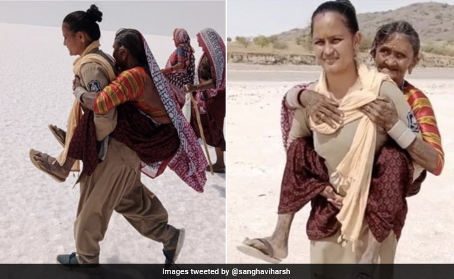 सोशल मीडिया पर आए दिन मानवता की मिसाल पेश करने वाली तस्वीरें और वीडियो वायरल होते रहते हैं. ऐसी ही एक तस्वीरें अब सोशल मीडिया पर वायरल हो रही है, जिसमें गुजरात (Gujarat) की एक महिला पुलिसकर्मी (Woman Constabla) ने मानवता की मिसाल पेश की है. इस महिला पुलिसकर्मी ने रेगिस्तान की तपती गर्मी में एक बुजर्ग महिला को 5 किमी तक अपने कंधे पर बैठाकर घर पहुंचाया. जानकारी के मुताबिक, यह बुजुर्ग महिला गुजरात के कच्छ (Kutch) में एक मंदिर में मोरारीबापू की रामकथा सुनने आई थी. गर्मी की वजह से वह बेहोश हो गई थी.