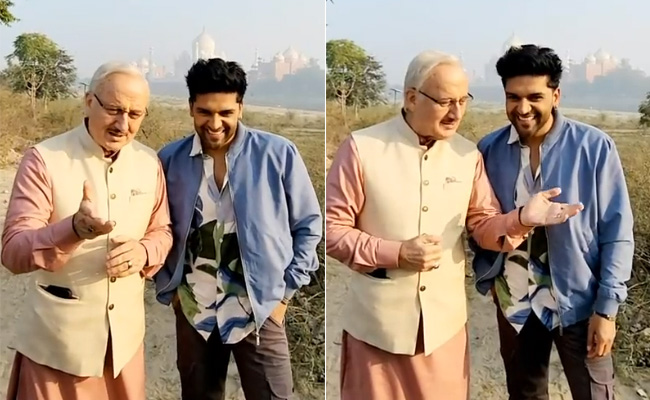 हाल में ही अनुपम खेर का एक और वीडियो इंटरनेट पर हर किसी का ध्यान अपनी ओर खींच रहा है, जिसमें वह गुरु रंधावा के साथ गाना गाते हुए सीखने की कोशिश करते नजर आ रहे हैं. वीडियो में देखा जा सकता है कि, अनुपम खेर एक्टिंग के बाद अब सिंगिग में हाथ आजमा रहे हैं. वीडियो की शुरुआत में अनुपम खेर को गुरु रंधावा के साथ ताजमहल के सामने खड़े देखा जा सकता है. इस दौरान अनुपम खेर गुरु रंधावा से गाना सीखने की बात करते नजर आ रहे हैं.