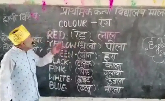 वीडियो में मास्टर से एक ब्लैकबोर्ड के सामने खड़े नजर आ रहे हैं. इस दौरान बोर्ड पर लिखा हुआ है, होली विशेष क्लास. इसके साथ ही ब्लैकबोर्ड पर अंग्रेजी, उच्चारण और हिंदी नामों के साथ सात रंग लिखे हुए हैं. इस दौरान खुद मास्टर जी इन रंगों से अपने गालों को सजाये हुए हैं और एक गाना गुनगुना रहे हैं. मास्टर जी गाना गाते हुए बता रहे हैं कि रेड का मतलब लाल होता है और येलो का मतलब पीला. इसी तरह ग्रीन का मतलब हरा और ब्लैक का मतलब काला होता है. अनूठी कक्षा का वीडियो ऑनलाइन बहुत पॉपुलर हो रहा है. वीडियो में बच्चे भी गाना गुनगुनाते नजर आ रहे हैं. इस बीच न सिर्फ बच्चे, बल्कि क्लासरूम में आराम से कुर्सी पर बैठीं दो और महिलाएं मास्टर साहब का गाना बड़े ध्यान से सुनती नजर आ रही हैं.