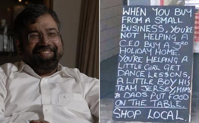 हर्ष गोयनका (Harsh Goenka shared a picture) ने एक हैंड रिटेन बोर्ड (handwritten board) की तस्वीर साझा की, जिसमें लिखा था, 'जब आप एक छोटे व्यवसाय से खरीदते हैं, तो आप एक सीईओ को तीसरा हॉलिडे होम खरीदने में मदद नहीं कर रहे हैं. आप एक छोटी लड़की को नृत्य सिखाने में मदद कर रहे हैं, एक छोटे लड़के को उसकी टीम की जर्सी. स्थानीय खरीदारी करें.' इस बोर्ड को पोस्ट करते हुए उन्होंने कैप्शन में लिखा, 'बहुत समझ में आता है, अपने छोटे विक्रेता से खरीदें'.