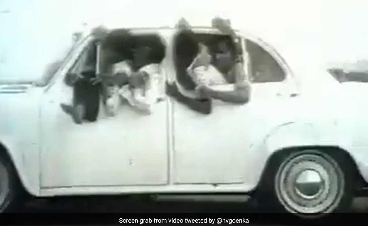 क्लिप में लोगों से खचाखच भरी एक सफेद एंबेसडर कार दिखाई गई है. वाहन के रुकते ही दो आदमियों के सिर कार की खिड़की से बाहर निकलते दिखाई दे रहे हैं. करीब 7 लोग पीछे की सीट से उतरते हैं और इसे देख रहा एक शख्स हैरत में उठता हुआ नजर आता है. जैसे ही लोग कार से बाहर निकलते हैं, कैमरा ऊपर उठने वाले टायर पर ज़ूम इन करता है.