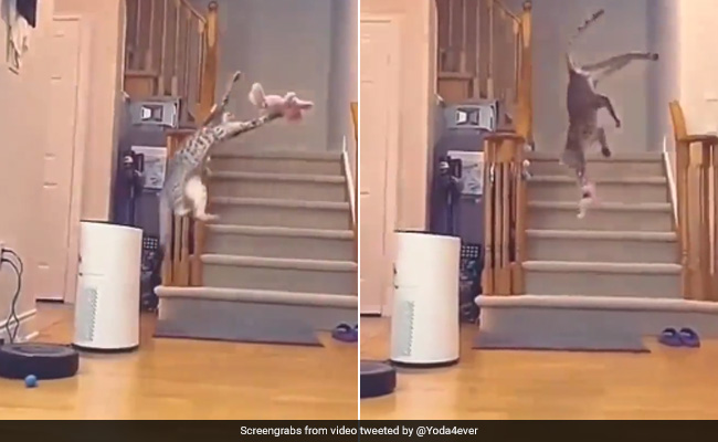 वीडियो में आप देख सकते हैं कि कैसे यह बिल्ली पहले आराम से कमरे में घूम रही होती है और उसके बाद फर्श पर बॉल लुढ़काती नजर आ रही है, ऐसा लगता है इसका ध्यान फर्श पर रखी चीजों पर है, लेकिन जैसी ही हवा में तैरती हुई कोई चीज उसे दिखाई देती है, पल भर में ही बिल्ली पीछे की तरफ जोरदार छलांग लगाते हुए हवा में उड़ती नजर आती है और देखते ही देखते अपने शिकार को जबड़े में दबोच लेती है. बिल्ली का निशाना नहीं चुकता, जैसे ही वो चीज नीचे गिरती है वो उसकी ओर झपटती दिखती है. बिल्ली का ये जंप सच में काबिल ए तारीफ है.