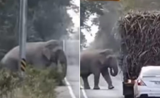 वीडियो में एक विशालकाय हाथी जंगल के बीच से गुजर रही सड़क के एक किनारे खड़ा आ रहा है. इस दौरान सड़क पर से गन्ना लदा एक ट्रक निकल रहा होता है, जिसे देखकर हाथी के मुंह में पानी आ जाता है. शायद यही वजह है कि, हाथी ट्रक के सामने आकर खड़ा हो जाता है और कुछ गन्ने निकालने लगता है. सोशल मीडिया प्लेटफॉर्म ट्विटर पर इस वीडियो को @DoctorAjayita नाम के हैंडल से शेयर किया है, जिसे खूब देखा जा रहा है.