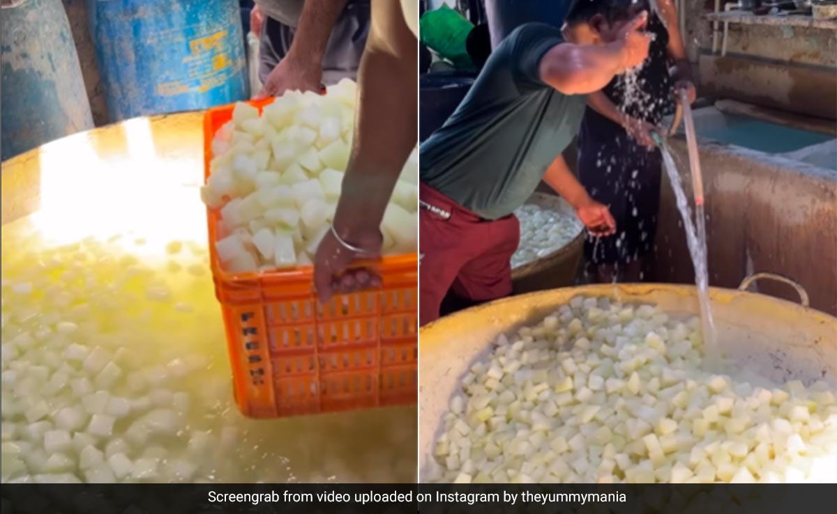 @theyummyMania द्वारा इंस्टाग्राम पर शेयर किया गया वीडियो, दर्शकों को पेठा तैयारी के विभिन्न चरणों को दिखाता है. इसकी शुरुआत मजदूरों द्वारा एक लौकी को काटने और उसके बीच के हिस्से को हटाने से होती है. फिर सब्जी को चपटा किया जाता है, तरल में डुबोया जाता है और छोटे टुकड़ों में काटा जाता है. इन टुकड़ों को कई सामग्रियों के साथ मिलाया गया है, जिसमें पानी भी शामिल है. आगे आप देखेंगे कि दो कर्मचारी मिश्रण में इस्तेमाल किए गए पानी से अपना चेहरा धोते हुए दिखाई देते हैं. वीडियो में पेठा बनाने की प्रक्रिया के बाकी चरणों को दिखाया गया है, जिसमें टुकड़ों को चीनी और चाशनी के साथ मिलाना शामिल है. वीडियो के कैप्शन में लिखा है, "आगरा का मशहूर पेठा बनाने का तरीका."