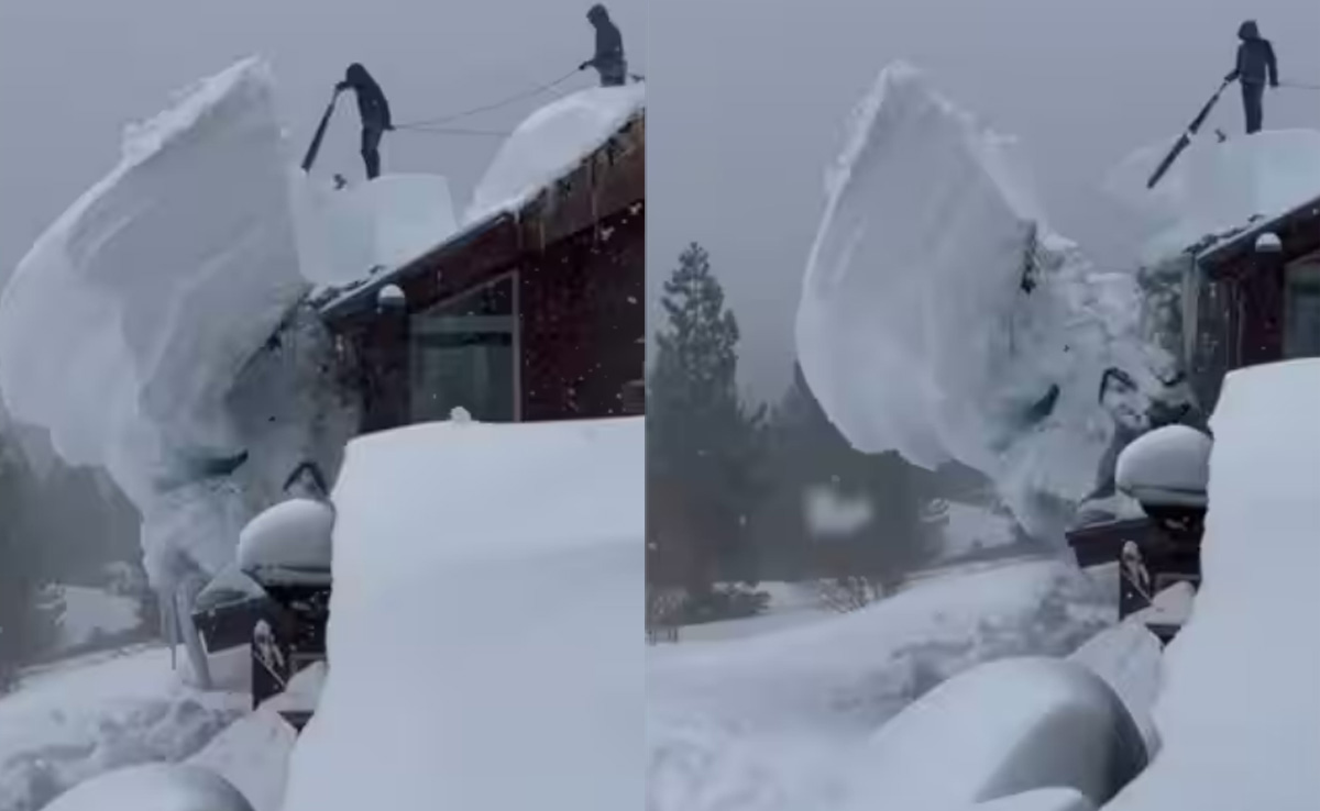 बर्फ एक ओर जहां कई पर्यटकों के दिल को बहलाने और मन को सुकून देने का काम करती है. वहीं दूसरी ओर यही बर्फ कई देशों में आफत का काम करती है, जैसा कि वायरल हो रहे इस वीडियो में देखने को मिल रहा है. वायरल हो रहा यह वीडियो संयुक्त राज्य अमेरिका के कैलिफोर्निया का बताया जा रहा है, जहां भारी बर्फबारी के बाद का नजारा देख हर कोई सहम गया है. वीडियो में दो लोग एक घर के ऊपर गिरी बर्फ को हटाते नजर आ रहे हैं. वीडियो में हटाई जा रही बर्फ गिरते हुए किसी बड़े विशालकाय पत्थर से बड़ी नजर आ रही है, जिसके वजन में दबकर कोई भी लकड़ी से बना घर पलभर टूट सकता है. वहीं किसी भी इंसान की सांसे थम सकती हैं.