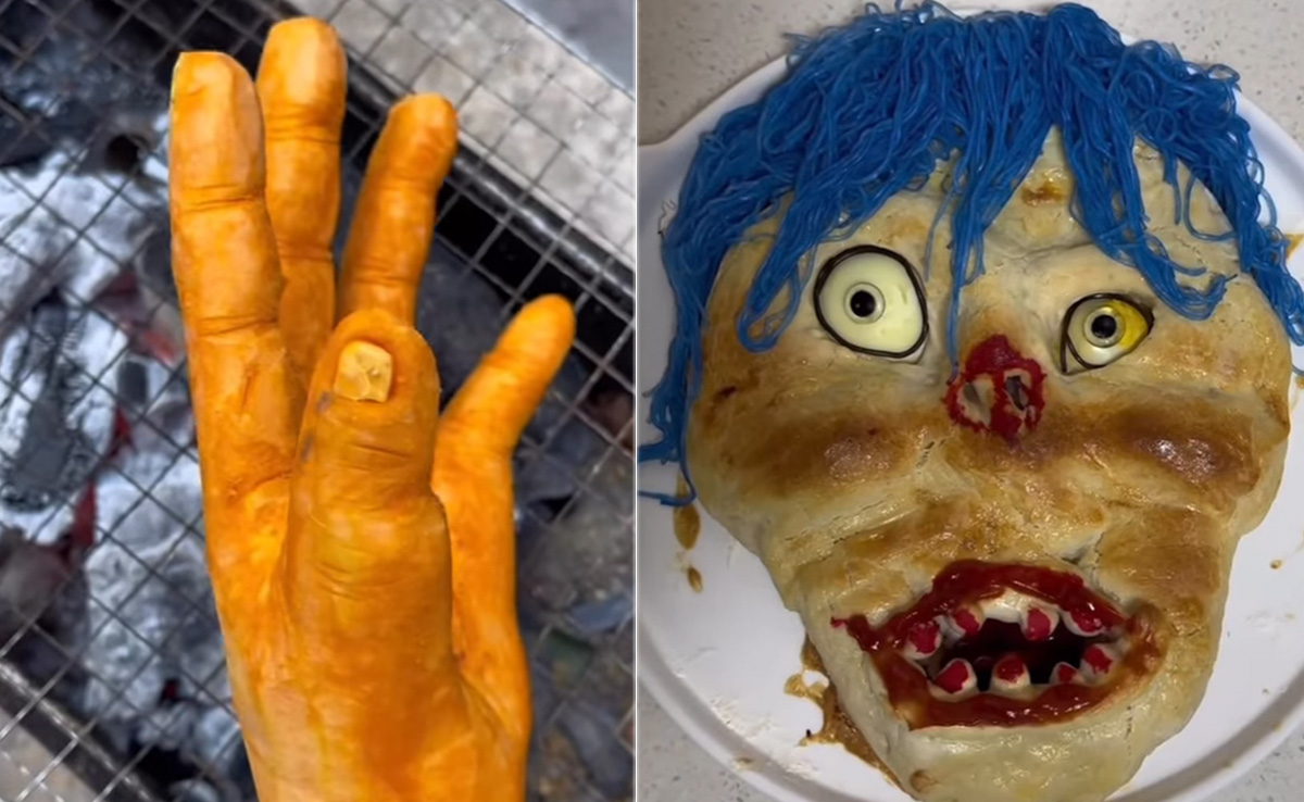 chinesestreetfood2023 नाम अकाउंट से शेयर हुए वीडियो को पहली नजर में देख आप डर जाएंगे. इंसानी हाथ और खोपड़ी को आग पर पकाया जा रहा है. इसे पकाने वाला, इस हाथ और खोपड़ी पर हल्दी और मसाले छिड़ता भी नजर आता है, लेकिन गौर से देखने पर इस हैलोवीन स्पेशल डिश की सच्चाई सामने आती है. दरअसल, ये इंसानी हाथ और खोपड़ी का आकार कद्दू से बना है, जिसे आग पर पकाकर हैलोवीन पार्टी में सर्व करने के लिए तैयार किया गया. वहीं वीडियो के आखिर में भूतिया ब्रेड बन नजर आता है, जो खौफनाक भूत सा दिख रहा है.
