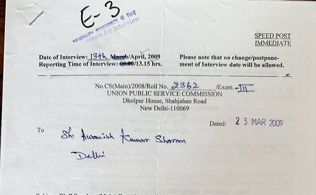 सोशल मीडिया प्लेटफॉर्म पर छत्तीसगढ़ कैडर के 2009 बैच के आईएएस ऑफिसर अवनीश शरण ने अपने ट्विटर हैंडल से यूपीएससी सिविल सेवा परीक्षा इंटरव्यू का अपना कॉल लेटर शेयर किया है. उनके इस पोस्ट पर कई यूजर्स एक के बाद एक रिस्पॉन्स देते नहीं थक रहे हैं. इस कॉल लेटर में इंटरव्यू की तारीख 13 अप्रैल 2009 बताई गई है.