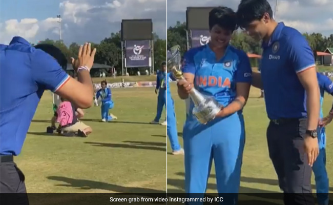 IND vs ENG U19 Women's T20 World Cup Final: अंडर-19 महिला टी20 विश्व कप के फाइनल में भारत की लड़कियों ने कमाल कर दिया है. टीम इंडिया ने शानदार प्रदर्शन करते हुए इंग्लैंड को सात विकेट से हराकर टूर्नामेंट जीत लिया है. इस जीते के साथ टीम इंडिया ने इतिहास रच दिया है. जीतने के बाद देश के सभी खिलाड़ी, राजनेता, अभिनेता सोशल मीडिया पर टीम को बधाई दे रहे हैं. वहीं एक वीडियो सोशल मीडिया पर बहुत ही तेजी से वायरल हो रहा है. दरअसल इस वीडियो में देखा जा सकता है कि ओलंपिक में गोल्ड मेडल जीतने वाले नीरज चोपड़ा (Neeraj Chopra With Team India) टीम इंडिया के खिलाड़ियों को बधाई दे रहे हैं. सोशल मीडिया पर यह वीडियो वायरल हो रहा है.