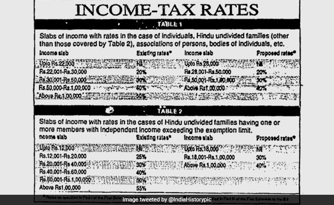 1992 के इनकम टैक्स स्लैब यह तस्वीर ट्विटर पर @IndiaHistorypic नाम के पेज से 30 जनवरी शेयर की गई थी. पोस्ट के साथ कैप्शन में लिखा- 1992 के बजट में न्यू इनकम टैक्स स्लैब. 28000 हजार रुपये पर कोई टैक्स नहीं. 28001 हजार से 50000 रुपये पर 20 प्रतिशत टैक्स. 50001 से 100000 रुपये पर 30 प्रतिशत टैक्स और 1 लाख रुपये से ज्यादा की इनकम पर 40 फीसदी इनकम टैक्स. तस्वीर सौजन्य से इंडियन एक्सप्रेस. इस ट्वीट को अबतक सैंकड़ों लाइक्स और कई रीट्वीट्स मिल चुके हैं. कुछ यूजर्स इस प्रतिक्रिया भी दे रहे हैं. एक यूजर ने लिखा-2023 का बता दे भाई. दूसरे ने लिखा- आज की तुलना में टैक्स रेट काफी कम है...