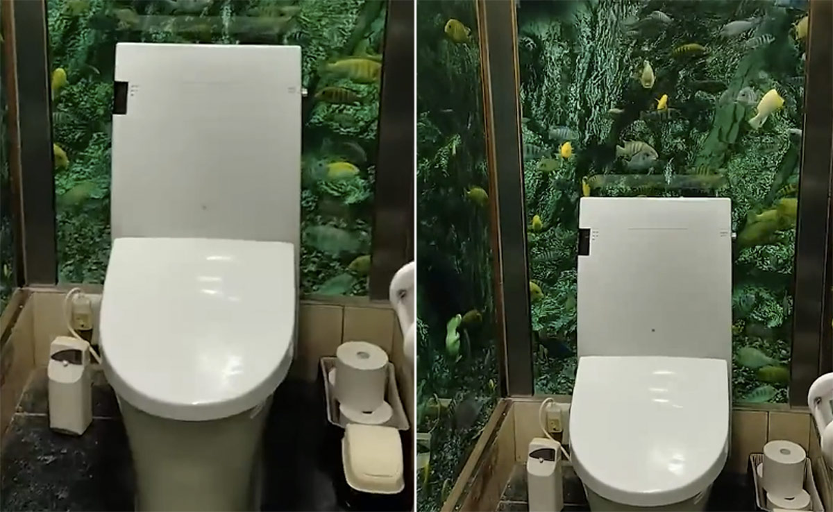 जापान के हिपोपो पापा कैफे में सजा एक्वेरियम टॉयलेट इसके कस्टमर्स के लिए एक अनोखा एक्सपीरियंस है. कैफे के अंदर का टॉयलेट पानी और मछलियों से भरी हुई कांच की दीवारों से घिरा हुआ है. टॉयलेट के अंदर जाने वाले कस्टमर्स को यहां समुद्र के पानी से घिरा हुआ महसूस हो सकता है. टॉयलेट में चारों ओर हरियाली और रंग-बिरंगी मछलियां नजर आती हैं. इस टॉपलेट का इंटीरियर सच में बेहद खूबसूरत है और अनोखा भी. इस अनोखे टॉयलेट का वीडियो सोशल मीडिया पर काफी देखा जा रहा है.
