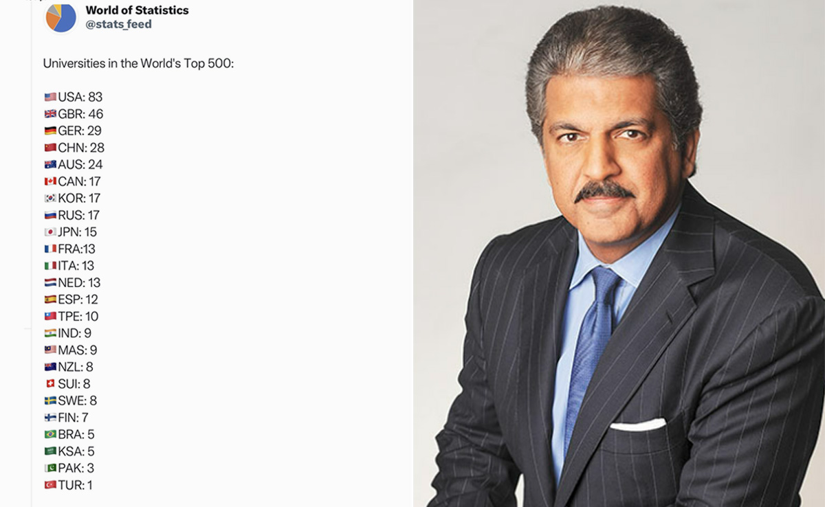 इस तस्वीर को कैप्शन देते हुए आनंद महिंद्रा ने लिखा, 'वह भारत को सबसे अधिक विश्वविद्यालयों वाले राष्ट्रों की सूची में सबसे ऊपर देखकर खुश हैं, लेकिन लक्ष्य मात्रा के बराबर गुणवत्ता बनाना है. हमारा लक्ष्य दोनों सूचियों पर अपनी रैंकिंग को सामान बनाना होना चाहिए!' इस ट्वीट को 1.3 मिलियन बार से अधिक देखा जा चुका है.