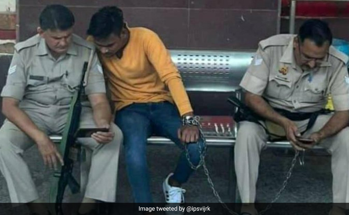 वायरल तस्वीर में आप देख सकते हैं कि अपराधी बीच में बैठा है, जिसके अगल-बगल दो पुलिसकर्मी बैठे हैं और दोनों ही पुलिसवाले अपने-अपने मोबाइल देखने में बिजी हैं. इस दौरान उन्होंने बंदूक को ऐसे ही रख रखा है. अपराधी का एक हाथ फ्री है. जबकि दूसरे हाथ में हथकड़ी बंधी है. उससे एक लंबी चेन भी जुड़ी है, जिसका एक हिस्सा हथकड़ी से बंधा है और दूसरा एक पुलिसकर्मी ने हाथ में पकड़ रखा है. ऐसे में अपराधी एक पुलिसकर्मी से सटा हुआ है और उसके फोन में झांक रहा है. यह देखकर लोग हैरान हैं.