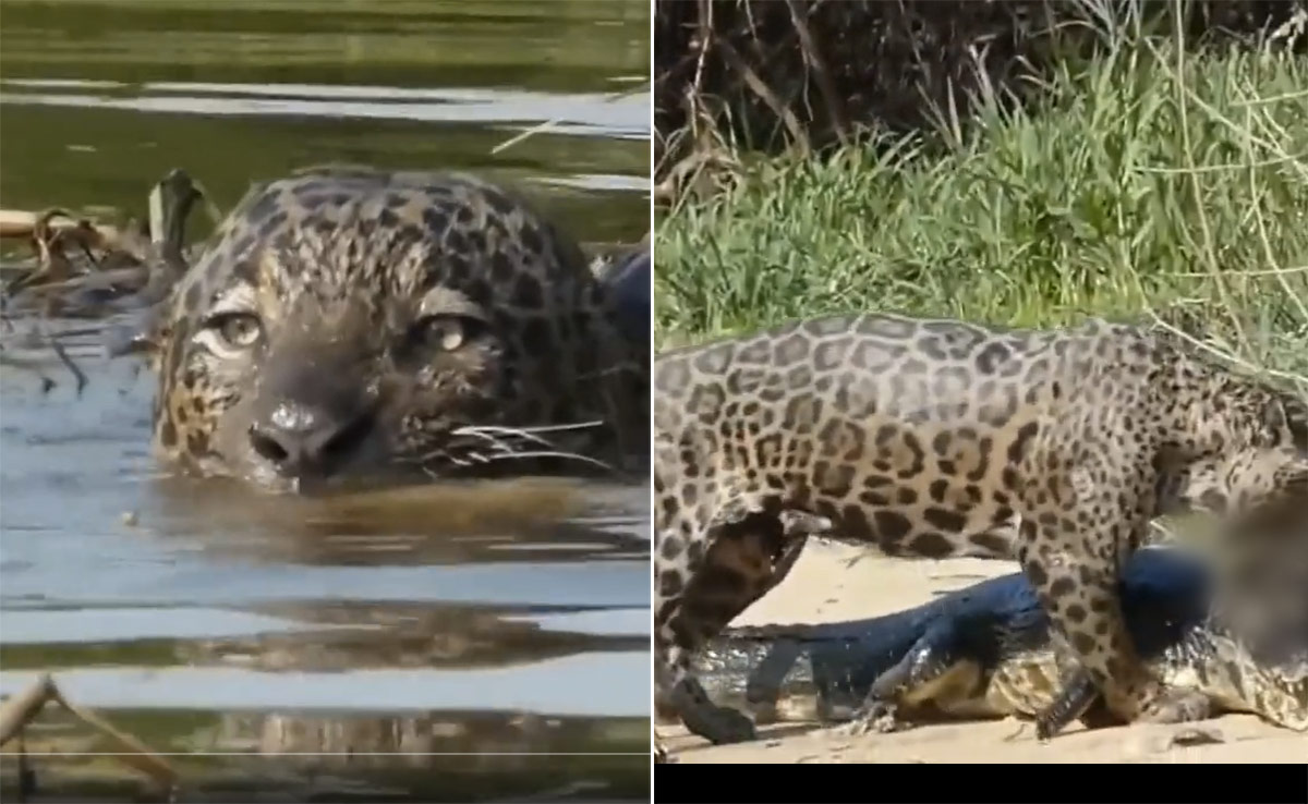 वायरल वीडियो में देखा जा सकता है कि फीमेल जगुआर चुपचाप पानी के अंदर छिपी रहती है. कभी सांस लेते हुए नज़र आती है तो कभी हलचल करते हुए. अचानक देखा जा सकता है कि वो मगरमच्छ पर हमला कर देती है. फिर वीडियो में देखा जा सकता है कि मगरमच्छ को पानी के बाहर लेकर जा रही होती है. सोशल मीडिया पर यह वीडियो लोगों को पसंद आ रहा है.