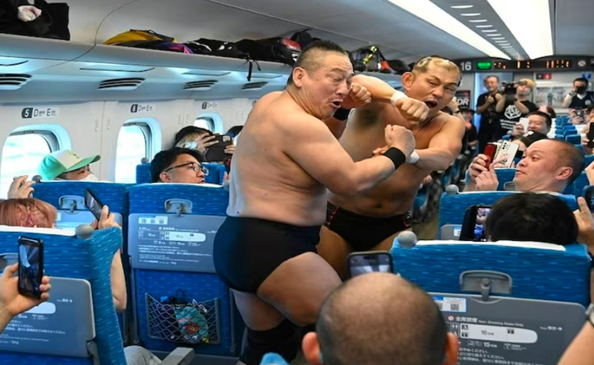WWE Style Match On Bullet Train: कुश्ती या रेसलिंग सुनते ही दिमाग में किसी रिंग की छवि उभर आती है. एक ऐसा अखाड़ा जहां पहलवान एक-दूसरे पर अपने दांव आजमाते हों, लेकिन क्या हो जब यही रेसलिंग किसी रिंग के बजाय चलती हुई बुलेट ट्रेन में होने लगे, तो हैरानी होना लाजिमी है. दरअसल, हाल ही में एक चलती बुलेट ट्रेन में रेसलिंग टूर्नामेंट देख पब्लिक भी हक्की-बक्की रह गई. यह अनोखा रेसलिंग मैच सुदूर जापान में एक खचाखच भरी बुलेट ट्रेन (bullet train in Japan) में हुआ, जहां आधे घंटे तक पहलवान (professional wrestlers) एक-दूसरे से मुकाबल करते हुए दर्शकों (passengers) का ध्यान खींचते रहे.