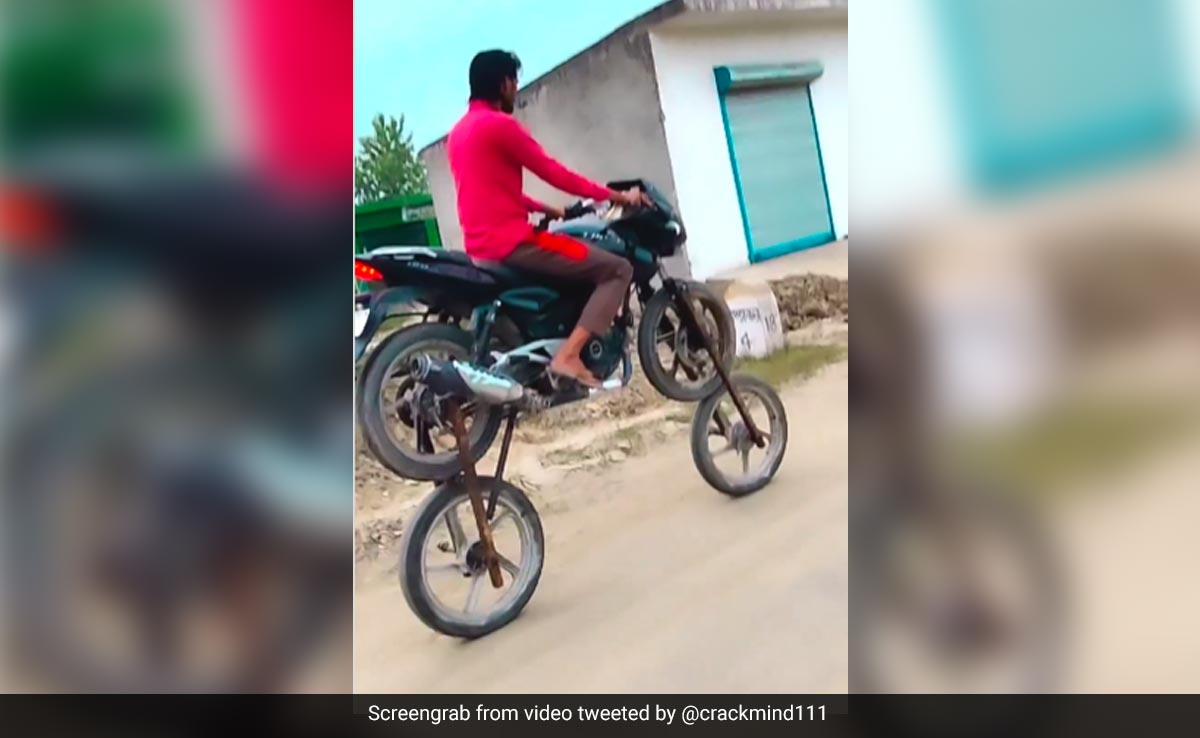 हम जब भी 4 व्हीलर कहते हुए किसी को सुनते हैं, तो दिमाग में बस कार या कोई बड़ी गाड़ी ही आती है, लेकिन क्या आपने कभी 4 व्हीलर बाइक देखी है. अगर नहीं देखी तो हमारे इस वीडियो में देख लीजिए. वायरल हो रहे इस वीडियो में आप देख सकते हैं कि एक शख्स पल्सर पर बैठ कर बड़े आराम से बाइक को चला रहा है. लेकिन ये बाइक आपको देखने में जरूर अजीब लग रही होगी, क्योंकि इसमें दो पहिए नहीं बल्कि चार पहिए लगे हैं. आप देख सकते हैं कि कैसे शख्स ने जुगाड़ करके पहिए के नीचे पहिया लगा दिया है. और इस जुगाड़ से शख्स ने बाइक को 4 व्हीलर बाइक बना दिया है.