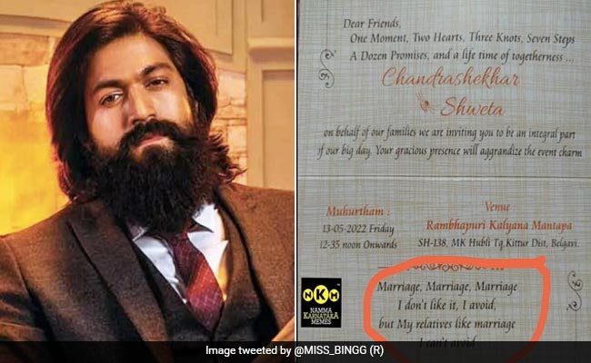 इस कार्ड में शादी की सारी जानकारी है. लेकिन जब आप कार्ड में नीचे की तरफ देखेंगे, तो रॉकी भाई का डायलॉग अलग अंदाज में लिखा नज़र आएगा है- Marriage... Marriage...Marriage. I dont Like it, I avoid, but my relatives like Marriage i can't avoid.' अर्थात- शादी... शादी... शादी. मुझे यह पसंद नहीं है, मैं टालता हूं, लेकिन मेरे रिश्तेदारों को शादी पसंद है. इसलिए मैं इससे बच नहीं सकता.