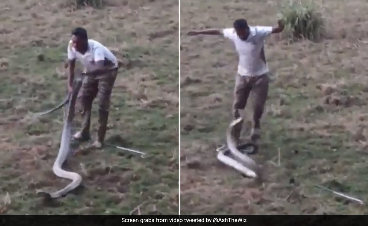 वायरल हो रहे इस वीडियो में आप देख सकते हैं कि सांप पकड़ने वाला शख्स झाड़ियों में से एक विशाल किंग कोबरा को पकड़ने की कोशिश कर रहा है. शख्स नंगे हाथों से पूंछ की ओर से किंग कोबरा को पकड़ता है और दूसरे हाथ में एक लोहे की छंड़ लिए हुए हैं. किंग कोबरा काफी गुस्से में दिख रहा है और जैसे ही शख्स उसके करीब आने लगता है वो पलटकर अपने फन से शख्स पर वार कर देता है. शख्स दोबारा उसे पकड़कर खाली जगह की ओर ले जाने लगता है, लेकिन किंग कोबरा इस दौरान बार-बार उस पर अटैक करता है.