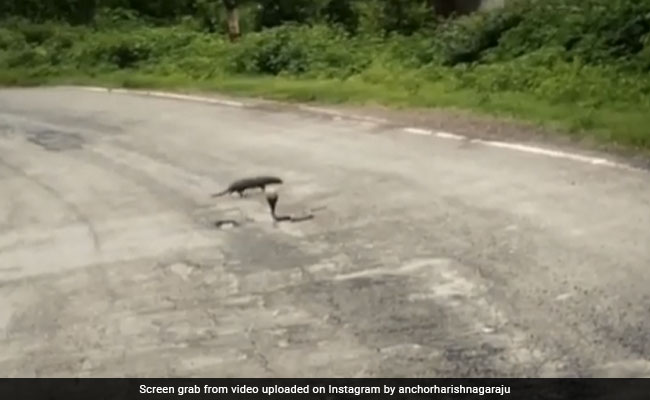 वायरल हो रहे वीडियो में आप देख सकते हैं कि एक किंग कोबरा बीच सड़क पर फन फैलाए बैठा है, काफी दूरी पर लोगों की भीड़ भी नजर आ रही है, जो किंग कोबरा को देख रही है. अचानक किंग कोबरा के सामने से एक नेवला गुजरता है. पहले तो कोबरा उसे देखता है, फिर अचानक अपना फन उठाकर वो नेवले पर हमला कर देता है. फिर नेवला भी गुस्से में सांप से उलझ जाता है और दोनों के बीच खतरनाक फाइट शुरु हो जाती है. नेवला और सांप दोनों के बीच खूब पटका पटकी होती है. फिर नेवला सड़क के किनारे पहुंचता है, तो पीछे-पीछे कोबरा भी आ जाता है. फिर दोनों लड़ने लगते हैं और अंत में नेवला सांप का बुरा हाल कर उसे अपने मुंह में दबाकर दूर जंगल की ओर उठा ले जाता है.