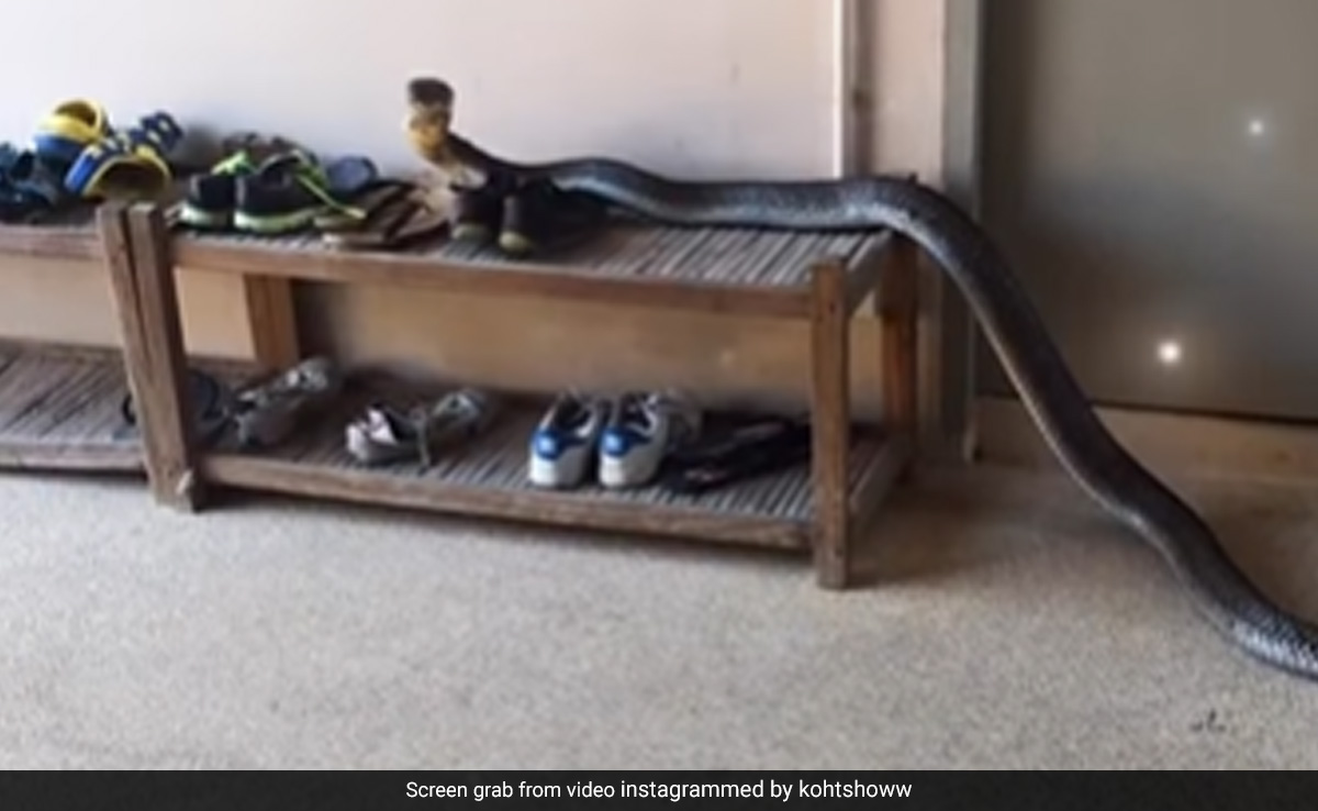 वायरल हो रहे इस वीडियो में आप देख सकते हैं कि एक विशाल किंग कोबरा एक घर के अंदर बड़े आराम से घूम रहा है. देखने में ये किंग कोबरा काफी भयानक लग रहा है. आप देख सकते हैं कि कैसे ये विशाल सांप घर में रखे जूते के रैक पर चढ़ रहा है और धीरे-धीरे आगे बढ़ रहा है. बीच में वो एक बार रुकता है और अपने फन फैला लेता है. कुछ ही देर में वो दोबारा आगे बढ़ने लगता है और जूते की रैक पर पूरी तरह से चढ़ जाता है.