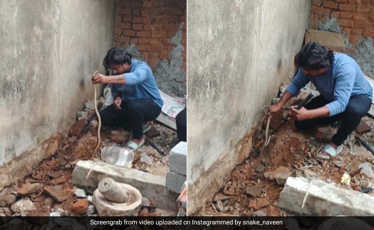 वायरल हो रहे इस वीडियो में आप देख सकते हैं कि एक शख्स दीवार के किनारे पर खुदाई कर रहा है. कुछ देर खोदने के बाद एक सांप दिखाई देता है, देखते ही शख्स उसकी पूंछ पकड़ लेता है और फिर थोड़ी और खुदाई करने के बाद वो सांप को बाहर निकालने में कामयाब हो जाता है. आप देख सकते हैं कि सांप काफी बड़ा है और कैसे हमला करने की फिराक में है. लेकिन, किसी तरह शख्स सांप को प्लास्टिक के डब्बे में बंद कर देता है.