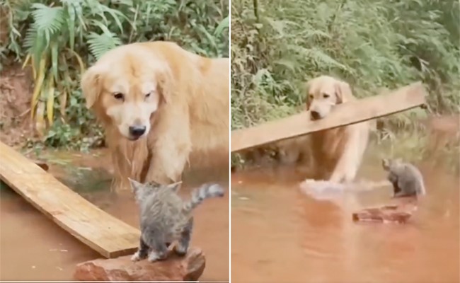 वायरल वीडियो में देखा जा सकता है कि कैसे एक बिल्ली का बच्चा पानी में फंस जाता है. वो बाहर निकलने की कोशिश करता है, मगर छोटा होने के कारण निकल नहीं पाता है. वायरल वीडियो में देखा जा सकता है कि कैसे एक कुत्ता लकड़ी की पट्टी लेकर आता है और पानी में छोटा पुल बना देता है. सोशल मीडिया पर यह वीडियो लोगों का दिल जीत रहा है. इस वीडियो को देखने के बाद कुत्ते की बड़ाई कर रहे हैं.