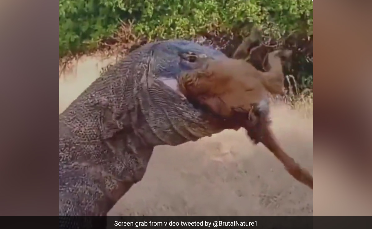 इंटरनेट पर ऐसे कई वीडियो हैं जो बड़े शिकारी जानवरों को जंगल में शिकार करते हुए दिखाते हैं. अब, कोमोडो ड्रैगन (Komodo dragon) का एक बछड़े (Calf) पर हमला करने और फिर उसे एक बार में जिंदा निगलने का भयानक वीडियो सामने आया है. बछड़ा, कोमोडो ड्रैगन के जबड़ों से बाहर निकलने की कोशिश करता है लेकिन उसकी सभी कोशिशें बेकार हो जाती हैं.