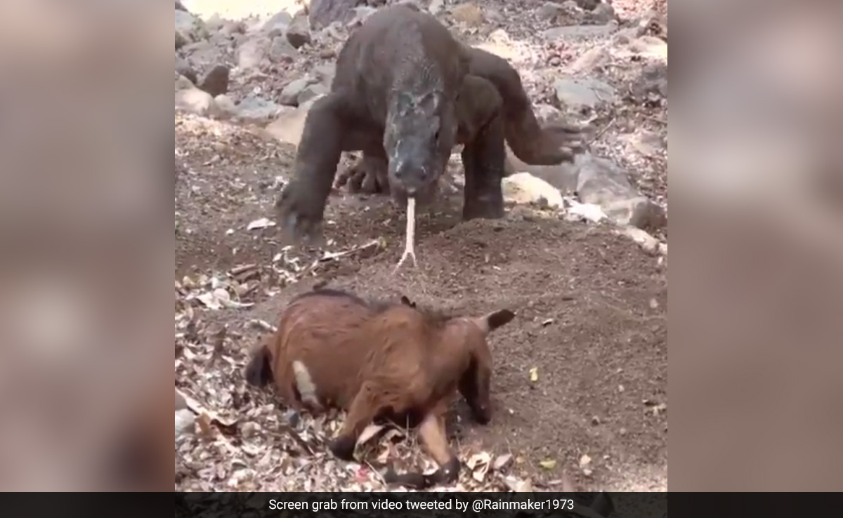 वायरल हो रहे इस वीडियो में आप देख सकते हैं कि एक बकरी नज़र आ रही है, जिसे देखकर साफ पता चल रहा है कि वो मर चुकी है. तभी सामने से एक कोमोडो ड्रैगन आता हुआ दिखाई दे रहा है, बकरी के आसपास कोई दूसरा जानवर नज़र नहीं आ रहा है, जिससे हम इस बात का अंदाज़ा लगा सकते हैं कि बकरी को इस कोमोडो ड्रैगन ने ही मारा होगा. कोमोडो ड्रैगन धीरे-धीरे बकरी के पास आता है और उसे अपने मुंह में भरने लगता है और देखते ही देखते वो बकरी को पूरा निगल जाता है.