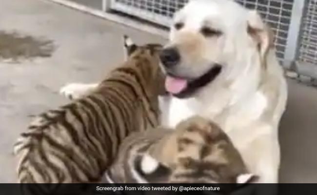 प्यार की भाषा हर कोई समझता है, चाहे वो इंसान हो या जानवर. इंटरनेट की दुनिया में मोहब्बत से जुड़े ऐसे कई वीडियोज की भरमार है, जिसमें प्यार की भाषा समझते जानवरों के क्यूट से वीडियोज दिल को छू लेते हैं. हाल ही में सोशल मीडिया (social media) पर वायरल इस वीडियो को देखकर इसका अंदाजा लगाया जा सकता है. वायरल (A video of a dog) हो रहे इस वीडियो में एक डॉगी (Labrador dog) बाघ के तीन शावकों के साथ खेलता नजर आ रहा है. इंटरनेट पर यह वीडियो (Viral Video) यूजर्स का दिल जीत रहा है.
