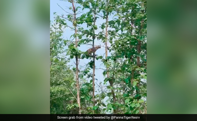 ट्वीट में कहा गया, "एक दुर्लभ दृश्य @pannatigerreserve। एक तेंदुए को पेड़ पर कूदकर एक बंदर के बच्चे का शिकार करते देखा जा सकता है."