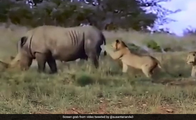 भारतीय वन सेवा (IFS) अधिकारी सुशांत नंदा द्वारा ट्विटर पर शेयर किए गए वीडियो में दो गैंडे दिखाई दे रहे हैं जो घास चबा रहे हैं. वहीं, पीछे से दो शेरों को उनकी पीठ के ठीक पीछे देखा जा सकता है. जबकि गैंडे अपने काम पर ध्यान दे रहे हैं, लेकिन तभी एक शेर पीछे से गैंडे के पास जाता है और डरे होने के बावजूद उसे छेड़ने की कोशिश करता है. हालांकि, गैंडे के पलटने से पहले, शेर जल्दी से वहां से भाग जाता है. IFS अधिकारी ने कैप्शन में मजाक में लिखा, "गलत नंबर डायल करना."