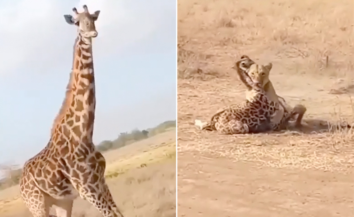 इंटरनेट पर अक्सर वाइल्ड एनिमल से जुड़े वीडियोज देखने को मिलते रहते हैं, जिसमें से कुछ तो बेहद खौफनाक होते हैं, जिनको देखकर लोगों की हालत खराब हो जाती है. वहीं नेचर लवर्स अक्सर ऐसे वीडियोज देखना पसंद करते हैं, जिनमें जानवरों की शरारत और उनकी छोटी-मोटी नोकझोंक देखने लायक होती है. हाल ही में एक ऐसा ही वीडियो देखने को मिल रहा है, जिसमें शेरनी जिराफ के बच्चे का शिकार करने की कोशिश कर रही होती है, लेकिन वो एक मां की बहादुरी के आगे विफल हो जाती है. वीडियो में भूखी खूंखार शेरनी जिराफ के बच्चे की ओर दौड़ते हुए, उसकी गर्दन दबोचकर बैठ जाती है, लेकिन तभी मादा जिराफ की बहादुरी और हमले के चलते शेरनी वहां से दुम दबाकर भाग निकलती है.