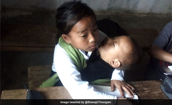 सोशल मीडिया पर एक छोटी बच्ची की तस्वीर वायरल (picture of a little girl) हो रही है, जिसमें वो अपनी गोद में सोती हुई छोटी बहन को लिटाकर क्लास में बैठी कर रही है. इस तस्वीर को मणिपुर के बिजली और वन मंत्री बिस्वजीत थोंगम (Manipur's Minister for Power and Forest Biswajit Thongam) द्वारा ट्विटर पर पोस्ट किया गया है, जिसपर लोग ढेरों कमेंट्स कर रहे हैं. वायरल हो रही तस्वीर में, मणिपुर के तामेंगलोंग की मीनिंगसिन्लिउ पमेई नाम की एक 10 वर्षीय लड़की अपनी बहन को गोद में लेकर स्कूल जाती है. क्योंकि, उसके माता-पिता खेती करने बाहर जाते हैं और मीनिंगसिन्लिउ क्लास में अपनी छोटी बहन को गोद में लेकर पढ़ाई करती है. बिस्वजीत थोंगम छोटी लड़की द्वारा किए गए समर्पण और प्रेम से प्रभावित हुए और उन्होंने अपने आधिकारिक ट्विटर हैंडल से फोटो शेयर की.