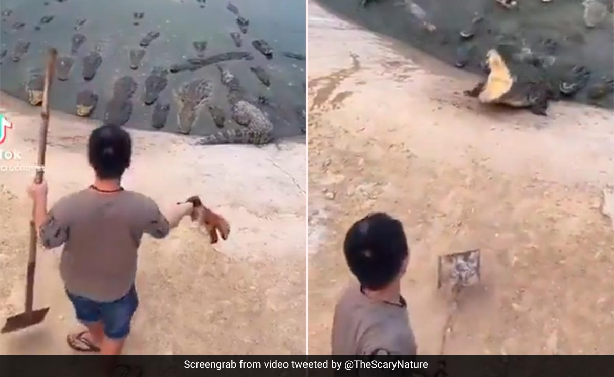 पानी का शैतान कहे जाने वाले मगरमच्छों से भला कौन वाक़िफ़ नहीं होगा. ये दरियादिल आदमखोर जानवर अपने शिकार को पलभर में चीड़ फाड़ कर एक कर देते हैं, जिनसे इंसान तो इंसान जंगल का राजा भी खौफ खाता है. सोचिए अगर कभी कोई खूंखार मगरमच्छ (Crocodile attack video) आपके सामने आ जाये तो क्या होगा, सोचकर भी डर के मारे पसीने छूट जाएंगे, लेकिन कुछ लोगों को खतरों से खेलने का शौक होता है, जो इन मगरमच्छों को भी पालतू जानवर की तरह ट्रीट करने लगते हैं, लेकिन कई बार यही गलती जान पर बन आती है, जैसा कि हाल ही में वायरल इस वीडियो में देखने को मिल रहा है. वायरल वीडियो में देखा जा सकता है कि, कैसे मगरमच्छों से भरे तालाब के सामने खड़े होकर एक शख्स उन्हें खाने के लिए मीट का टुकड़ा (Man feeding crocodiles video) दे रहा है, लेकिन अगले ही पल जो देखने को मिलता है, उसे देखकर आपके भी हाथ-पैर फूल जाएंगे.