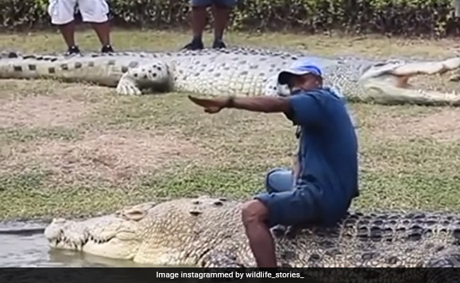 वायरल हो रहे इस वीडियो में आप देख सकते हैं कि दो मगरमच्छ नजर आ रहे हैं. एक जमीन पर लेटा है और दूसरा पानी के अंदर है. तभी एक शख्स पहले तो मगरमच्छ को कुछ खाने के लिए देता है फिर उसके ऊपर आकर बैठ जाता है और डांस करने लगता है. कभी वो शख्स कैमरे के सामने देखकर पोज भी देने लगता है. सामने खड़े कई लोग उसका वीडियो बना रहे हैं.