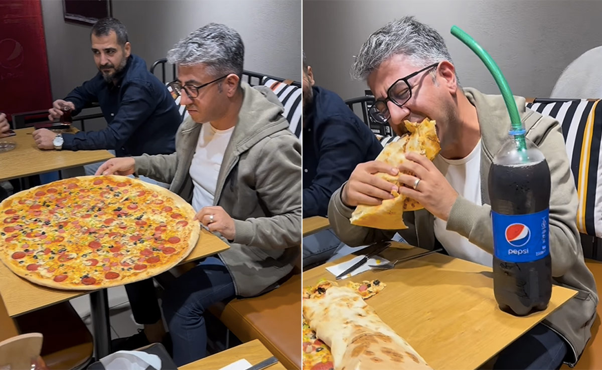 İlter Avşar नाम के इंस्टाग्राम अकाउंट से शेयर हुए इस वीडियो में शख्स के लिए रेस्टोरेंट में जाइंट साइज का बड़ा सा पिज्जा सर्व किया जाता है. इतना ही नहीं इस पिज्जा के साथ उसे ढ़ाई लीटर वाली कोला की बोतल दी जाती है, जिसमें हरे रंग का मोटा सा पाइल लगा दिखता है. ऐसे पाइप का इस्तेमाल आमतौर पर पानी सप्लाई के लिए होता है, लेकिन शख्स इसी पाइप से कोला पीता नजर आ रहा है. वहीं पिज्जा का साइज इतना बड़ा दिखता है कि, पूरी टेबल ही उससे भर जाती है. इस अजीबोगरीब पिज्जा को देखकर पास में बैठा एक शख्स भाग खड़ा होता है. पिज्जा खाना का शख्स का स्टाइल भी कमाल का है, वह पहले पिज्जा को रोल करता है और फिर रोल के एक टुकड़े को काट कर दोनों हाथों से पिज्जा को मुंह में ठूंसने लगता है.