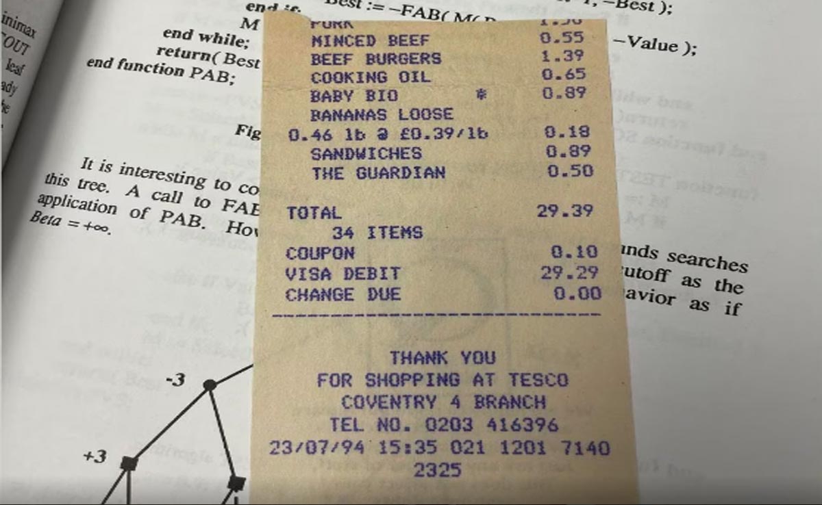 शख्स को किताब में मिली रसीद (Tesco 1994 receipt in book)