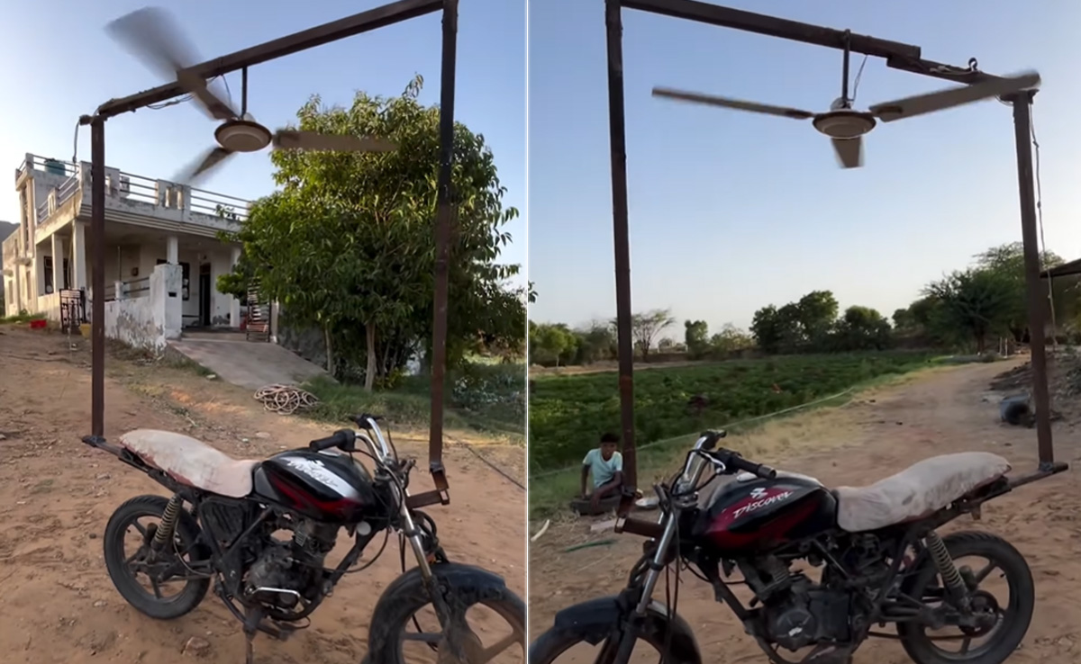 क्या आपने कभी बाइक पर ऐसा पंखा लगा देखा था? जैसा कि वायरल हो रहे इस अजीबोगरीब वीडियो में देखने को मिल रहा है. वीडियो में देखा जा सकता है कि, कैसे एक शख्स ने जुगाड़ की मदद ऐसा कारनामा कर दिखाया है, जिसे देखकर लोग सोच में पड़ गए हैं. वीडियो में देखा जा सकता है कि, कैसे मोटरसाइकिल पर एक लोहे का फ्रेम लगाकर सीलिंग फैन फिट कर दिया गया है, जिसे देखकर ऐसा लग रहा है मानो बाइक पर कोई छत हो.