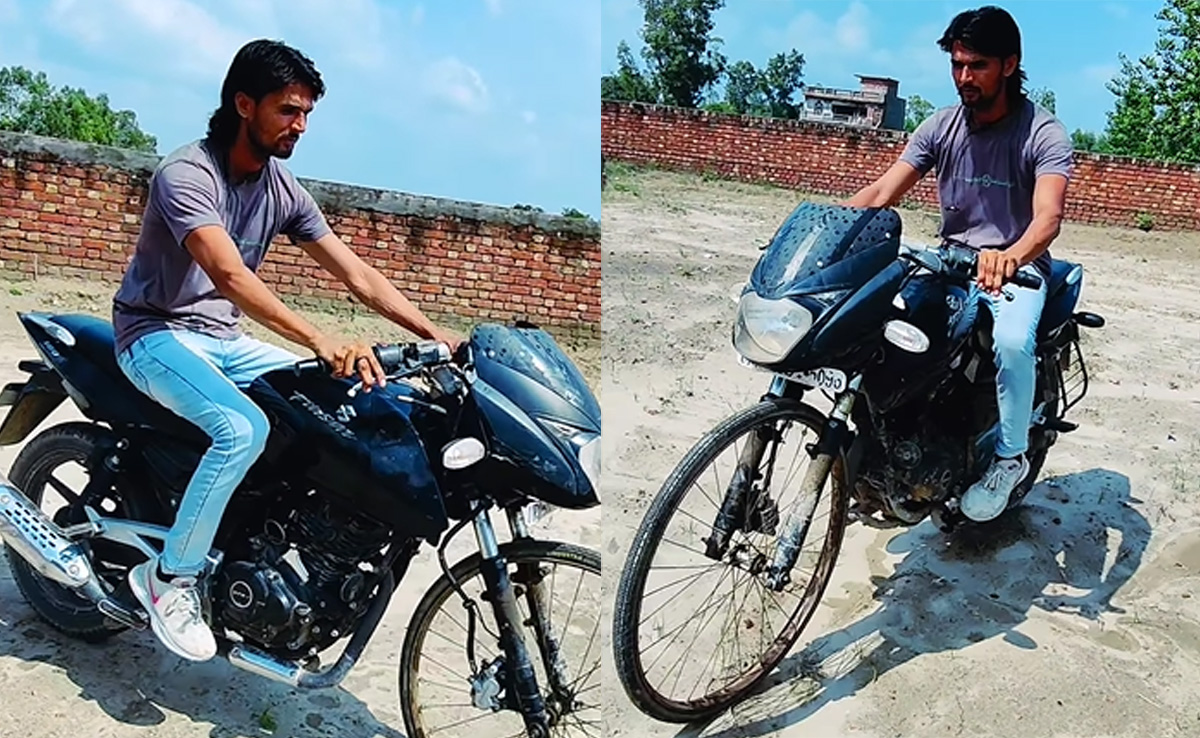 देसी जुगाड़ के मामले में लोगों का जवाब नहीं, लेकिन कुछ लोग जुगाड़ के नाम पर खेल कर देते हैं. हाल ही में एक शख्स का एक ऐसा ही अजीबोगरीब जुगाड़ वीडियो लोगों को कंफ्यूज कर रहा है. वीडियो में देखा जा सकता है कि, कैसे एक शख्स ने गजब का तिकड़म लगाकर बाइक के आगे वाले टायर को निकालकर उसमें साइकिल का पहिया फिट (bicycle wheel fitted in front of Pulsar bike) कर दिया है. यही नहीं शख्स बड़े मजे से इस अजीबोगरीब जुगाड़ बाइक को चलाते हु्ए भी नजर आ रहा है. यकीन न हो तो आप खुद ही देख लें यह वीडियो.