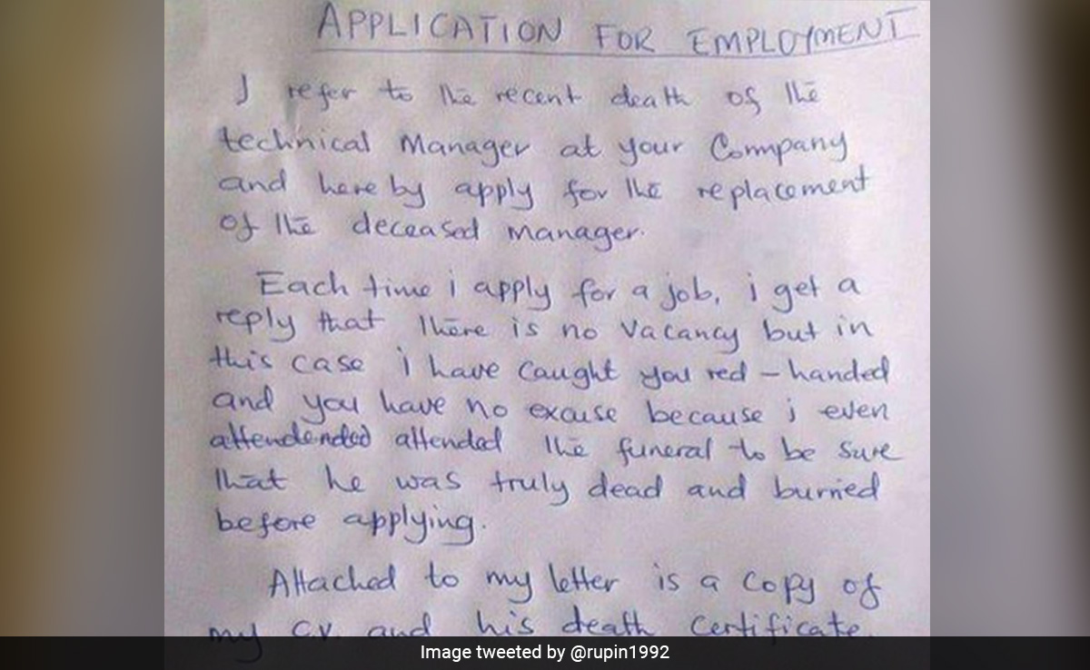 आईपीएस रुपिन शर्मा (IPS Rupin Sharma) ने ट्विटर पर एक पोस्ट शेयर किया है. जिसके कैप्शन में उन्होंने लिखा- 'बेस्ट जॉब एप्लीकेशन' (Best Job Application). शेयर की गई तस्वीर में देखा जा सकता है कि एक पेपर पर हाथ से एक नोट लिखा है. नौकरी के लिए आवेदन. आपकी कंपनी में टेक्निकल मैनेजर की हाल ही में हुई मृत्यु का संदर्भ देते हुए मैं ये कहना चाहता हूं कि मुझे उनकी जगह पर नौकरी पर रख लिया जाए. अभी तक मैंने इस कंपनी में कई बार आवेदन किया, लेकिन हर बार एक ही जवाब मिला कि यहां वेकेंसी नहीं है. अब मैंने आपको रंगे-हाथों पकड़ लिया है, तो कोई बहाना नहीं चलेगा. यही नहीं मैं मैनेजर के अंतिम संस्कार में भी शामिल हुआ. ताकि इस बात की पुष्टि हो सके कि क्या वाकई मैनेजर की मौत हुई है या नहीं. इतना ही नहीं, हद तो तब हो गई जब शख्स ने कवर लेटर के साथ मैनेजर का डेथ सर्टिफिकेट भी अटैच कर दिया.