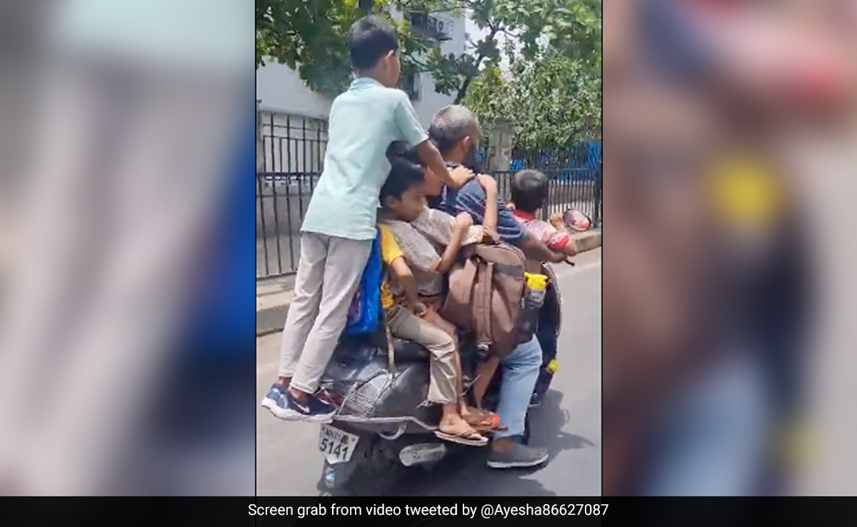 वायरल हो रहे इस वीडियो को ट्विटर पर @Ayesha86627087 नाम की यूजर ने शेयर किया है. 9 सेकंड की इस क्लिप में आप देख सकते हैं कि कैसे एक शख्स अपने साथ स्कूटी पर इतने बच्चों को बैठाकर चला जा रहा है. एक बच्चा स्कूटी में पीछे लगे सपोर्ट पर खड़ा है, तीन बच्चे बीच में बैठे हैं और दो आगे खड़े हैं. एक बच्चा बुरी हालत में किसी तरह स्कूटी की बाईं ओर लटका हुआ है. इतना ही नहीं, शख्स ने हेलमेट भी नहीं लगा रखा है. राह चलते किसी शख्स ने इस वीडियो को रिकॉर्ड लिया है और देखते ही देखते ये वीडियो सोशल मीडिया पर वायरल हो गया.