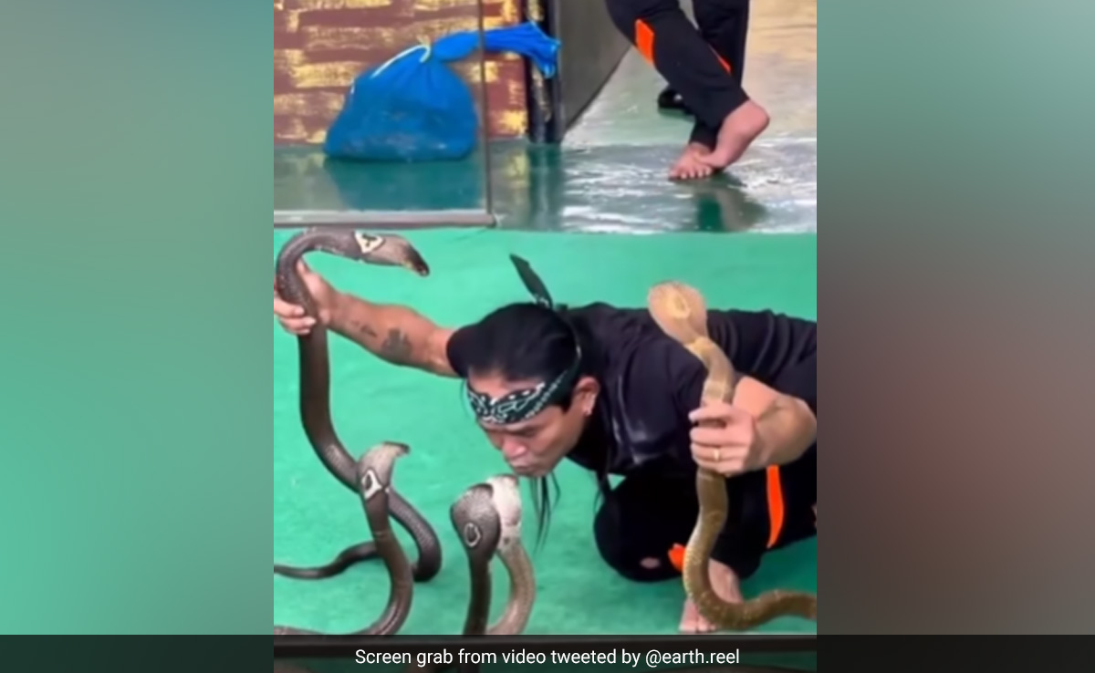 वायरल हो रहे इस वीडियो में एकसाथ 5 किंग कोबरा फन फैलाए बैठे नज़र आ रह हैं. और उनके सामने ही एक शख्स भी बैठा है. शख्स किंग कोबरा के बेहद करीब बैठा है. शख्स उन्हें छेड़ रहा है, छू रहा है और उनके सामने बैठकर ढेरों कलाकारियां कर रहा है. सभी किंग कोबरा भी एक एक करके उसपर अपने फन से वार रहे हैं. कुछ देर बाद आप देखेंगे कि शख्स दो किंग कोबरा को अपने हाथों में उठा लेता है और सामने बैठे एक किंग कोबरा को झुककर किस कर रहा है.
